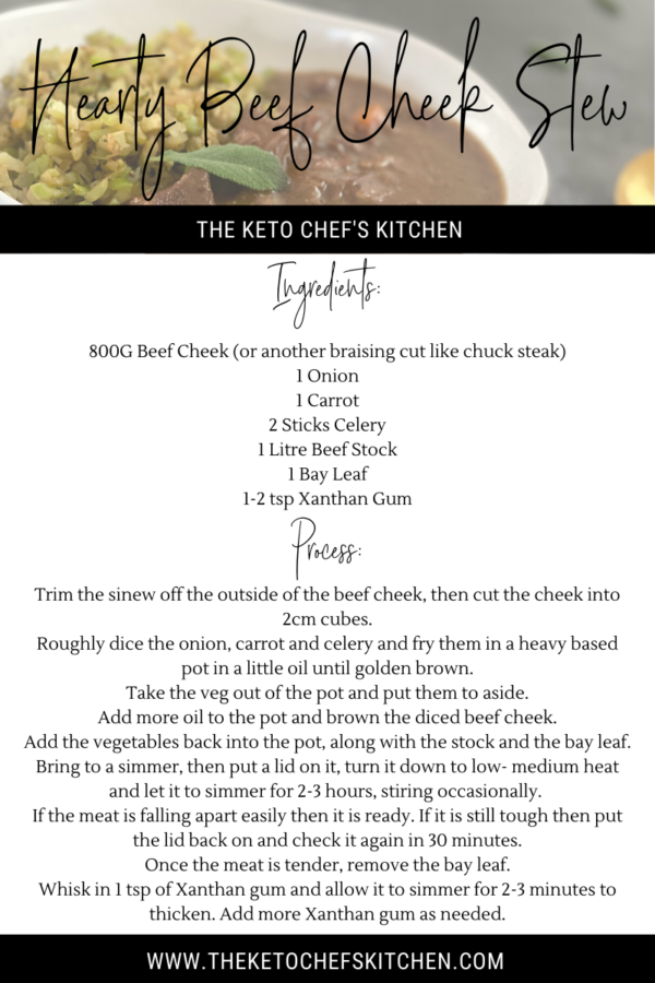 Keto winter warmers certianly make you feel whole! This keto/low carb beef cheek stew makes 6 portions, so it’s great for the whole family or meal prep. You can substitute the beef cheek for any other secondary cut like blade steak, chuck steak etc.