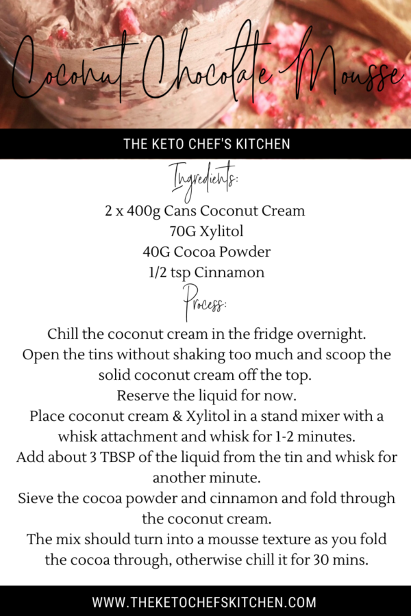 This honestly is now my favourite keto chocolate treat. So quick to make because I now leave coconut cream I my fridge at all times so I can whip this up whenever I get a chocolate craving! 4 ingredient chocolate mouse? Heck yes!