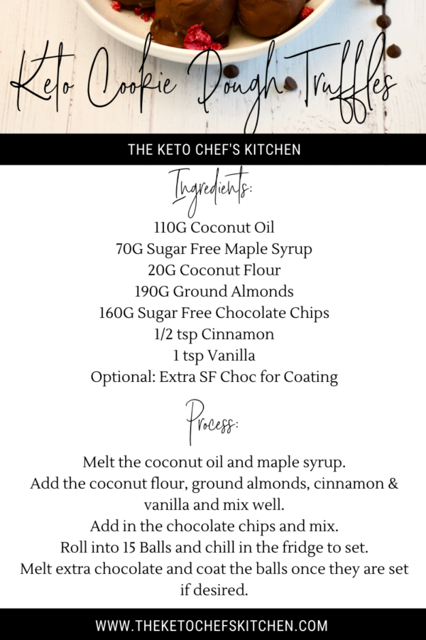 These cookie dough truffles are great to have in the fridge or freezer for a quick sweet treat! If you can find a great sugar free chocolate with no milk powder then they’re vegan too! Super quick and easy to whip up.