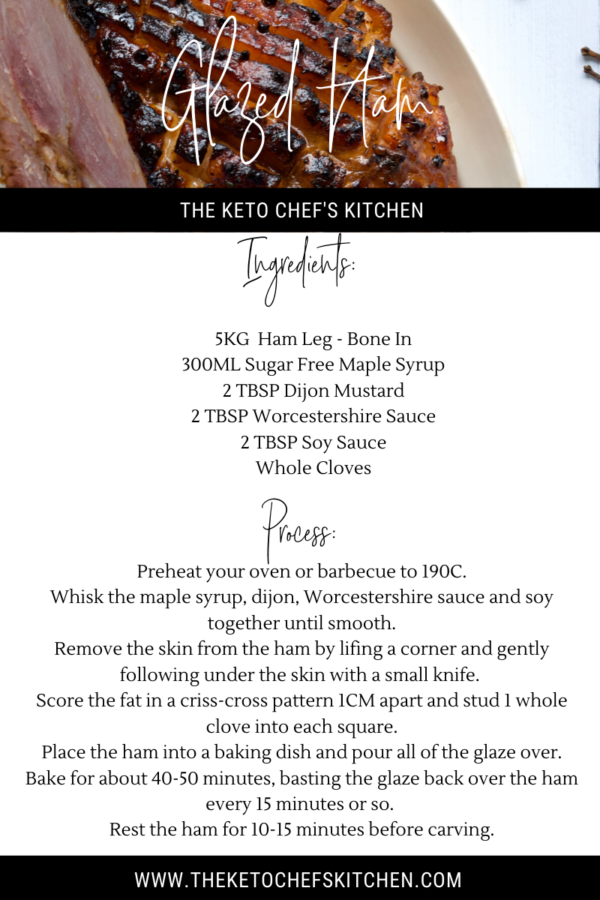 Low carb, sugar free, keto Christmas ham glaze. Super easy, and if you’ve got space on the BBQ for it, even better. I buy disposable foil trays for cooking this on the BBQ, less time scrubbing in the kitchen later!