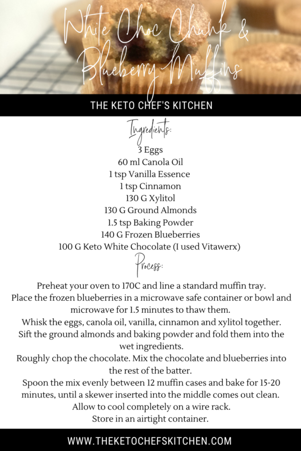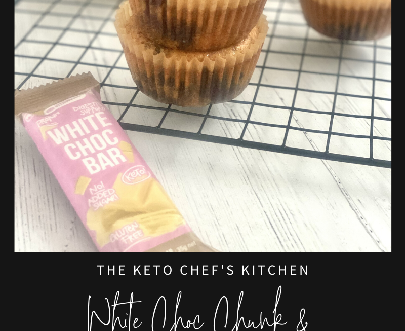 This white chocolate chunk & blueberry muffin recipe is keto, low carb, gluten free, sugar free and bloody tasty!