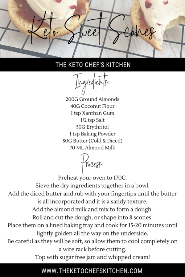 If you’re missing that sweet afternoon high tea-vibe snack, you’re welcome! These Keto sweet scones with jam and cream will really hit the spot!